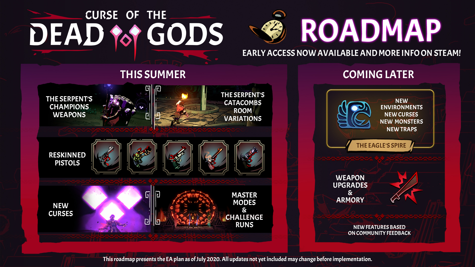 Depuis la sortie du jeu en Accès Anticipé, Curse of the Dead Gods s’enrichit régulièrement de nouveaux contenus. Les équipes de Passtech Games travaillent d'arrache-pied pour proposer au cours des mois à venir de nouveaux modes de jeu, diverses améliorations et fonctionnalités ainsi qu’un troisième environnement inédit à découvrir dans la roadmap ci-dessous.